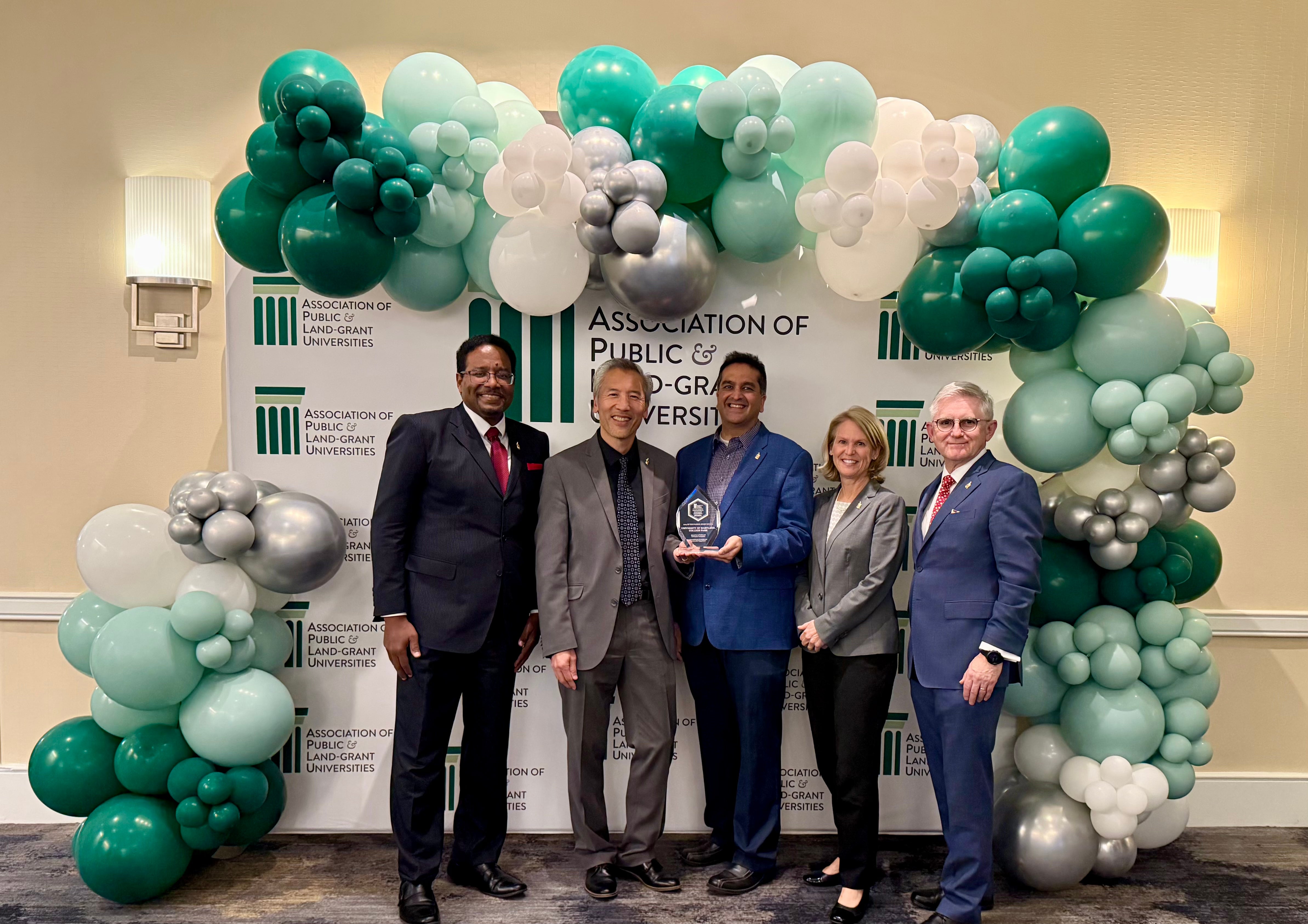 President Pines, Dean Chang, Sammy Popat, Provost Rice and VPR O'Shea receive the award in-person
